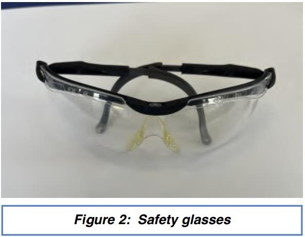 The proper use of personal protective equipment is the best way to protect oneself when working around high-voltage circuits. Eye protection must always be worn. The eye protection should have plastic frames, side shields, and meet the ANSI Z87.1 standard (See Figure 2 - Safety glasses).