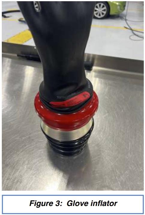 The gloves must be rated at least 1,000 volts and class “)” by ANSI/ASTM. The gloves are date stamped and must be recertified six months after opening by a qualified glove inspection laboratory. Gloves that remain sealed in the package that they were shipped must be recertified after 1 year. A clean leather outer glove needs to be worn to protect the HV rubber glove from any material that might create damage and compromise the insulation properties. The gloves should be visually inspected and tested with a glove inflator before each use (See Figure 3 – Glove inflator).