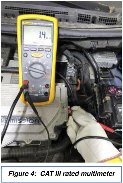 The digital multimeter and test leads used on high-voltage circuits should be category III rated at 1000 volts (CAT III). The International Electrotechnical Commission (IEC) establishes the standard to ensure the meter can provide accurate measurements of high-voltage circuits (See Figure 4 – CAT III rated multimeter). The failure to use the appropriately rated meter may result in inaccurate voltage reading and potential safety risk to the technician.